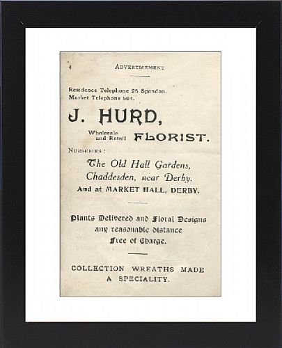 14x11 Framed Print, Black Satin Frame White Digital Mat. , Advertisement for J Hurd, Florist, Chaddesden and Derby. Advertisement for J Hurd, Florist, Wholesale and Retail, Chaddesden and Derby. Nurseries at the Old Hall Gardens, Chaddesden, and at the Market Hall, Derby. Plants delivered and floral designs. . Chosen by Mary Evans. 14x11 wooden frame with digital mat and RA4 print. Finished back including brown backing paper, hanging bracketCustomer Reviews
