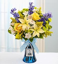 Celebrate the birth of their sweet baby boy with a beautiful, hand-designed arrangement of roses, lilies, delphinium, alstroemeria and more. Arriving in a true-blue glass gathering vase, it comes complete with a magnetic mini photo frame the new parents can use to display a picture of their new arrival. Stunning gathering of fresh roses, lilies, delphinium, alstroemeria, poms, solidago and salal Artistically hand-designed by our select florists in a cobalt blue glass gathering vase accented with stylish ribbon; vase measures 10"H Includes a keepsake magnetic mini photo frame Large arrangement measures approximately 22.5"H x 12.5"W Medium arrangement measures approximately 20"H x 11.5"W Small arrangement measures approximately 18.5"H x 10.5"W Our florists hand-design each arrangement, so colors, varieties, and container may vary due to local availability